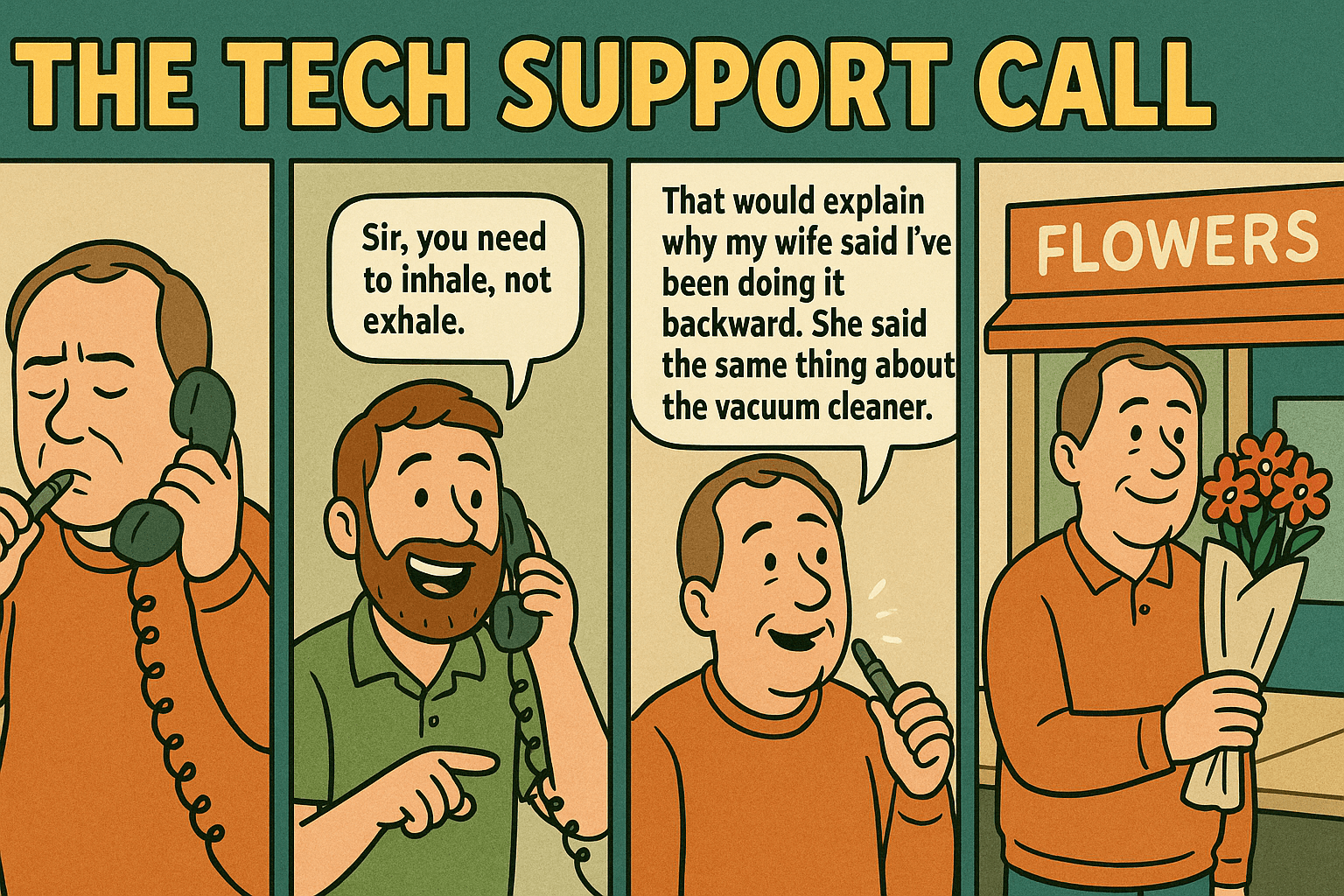 Customer: “It’s not working. I’ve been blowing into it for 20 minutes.” Budtender: “Sir, you need to inhale, not exhale.” Customer: long pause “That would explain why my wife said I’ve been doing it backward. She said the same thing about the vacuum cleaner.”